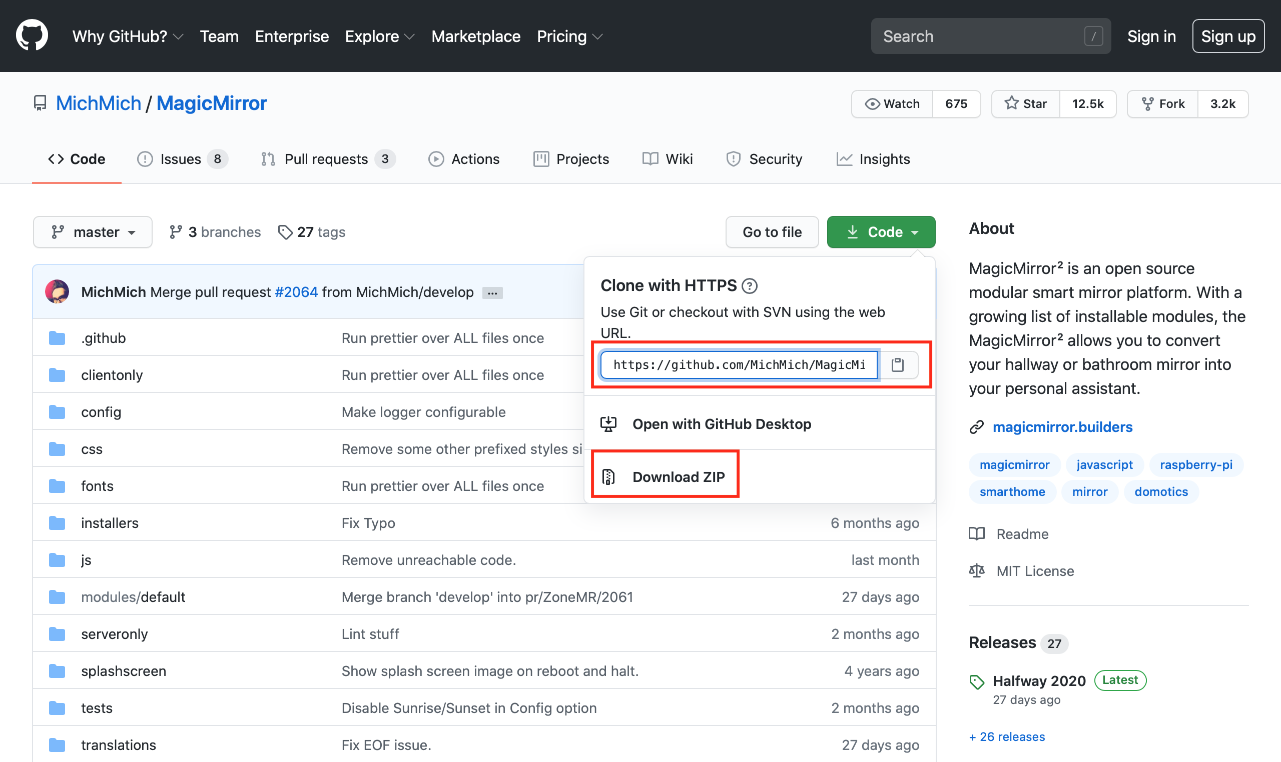 설치가 끝나면 github에서 MagicMirror2 소스를 받아 npm install 을 진행하면 된다