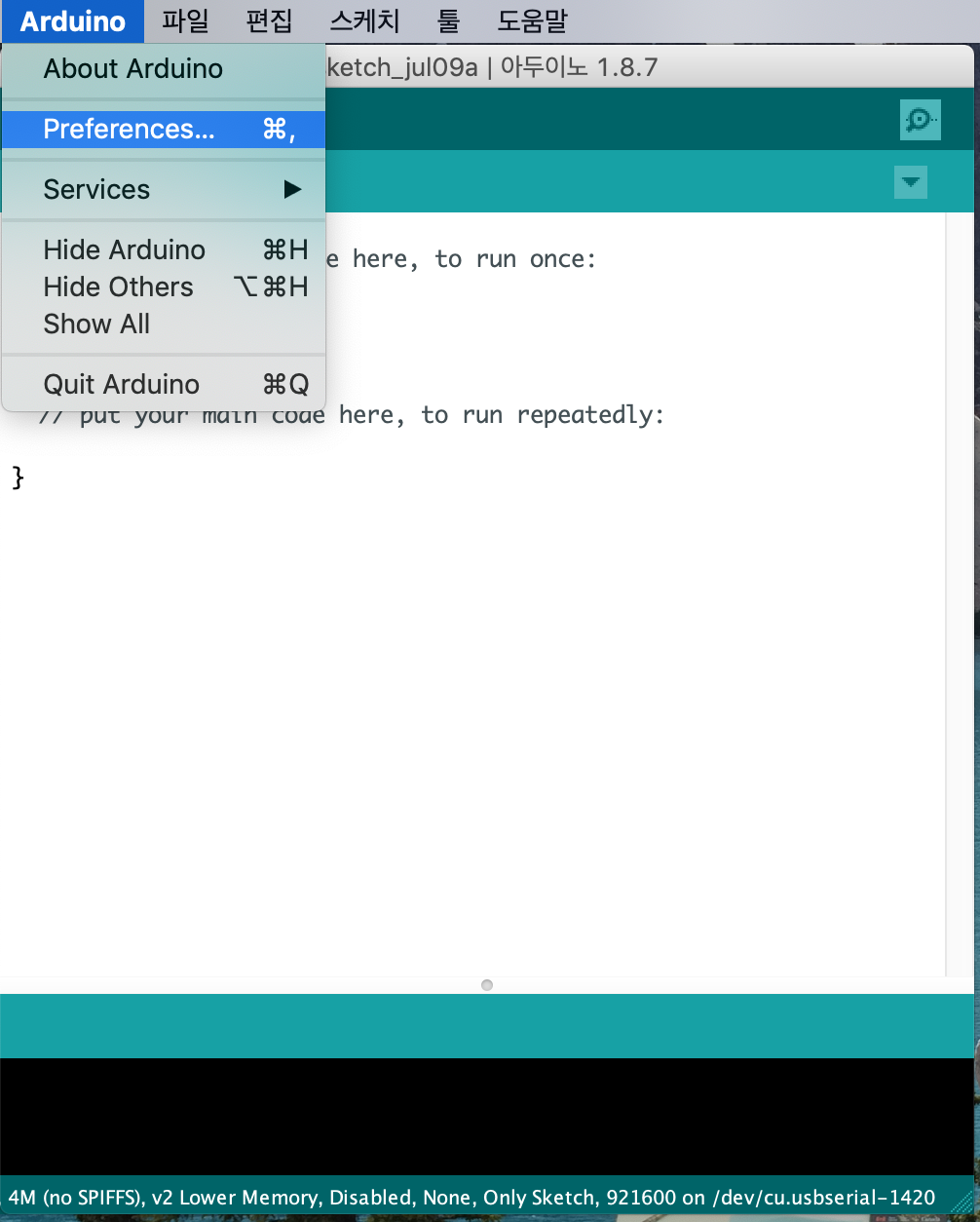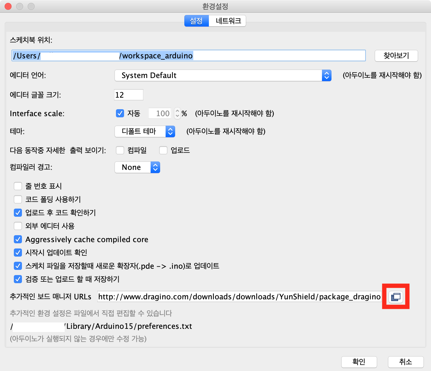 제공된 URL을 설정 -> 추가적인 보드매니져 URL(Additional Boards Manager URLs) 에 입력하고