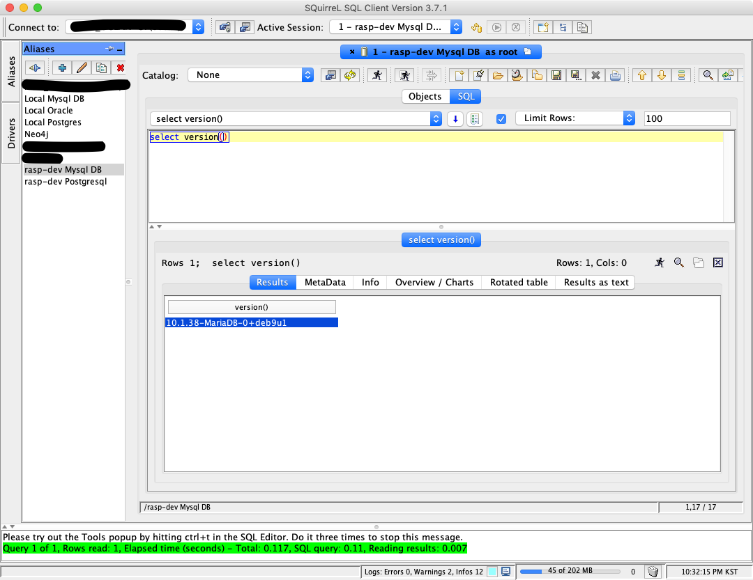 Database changed MariaDB [mysql]> select version(); +--------------------------+ | version() | +--------------------------+ | 10.1.38-MariaDB-0+deb9u1 | +--------------------------+ 1 row in set (0.00 sec)