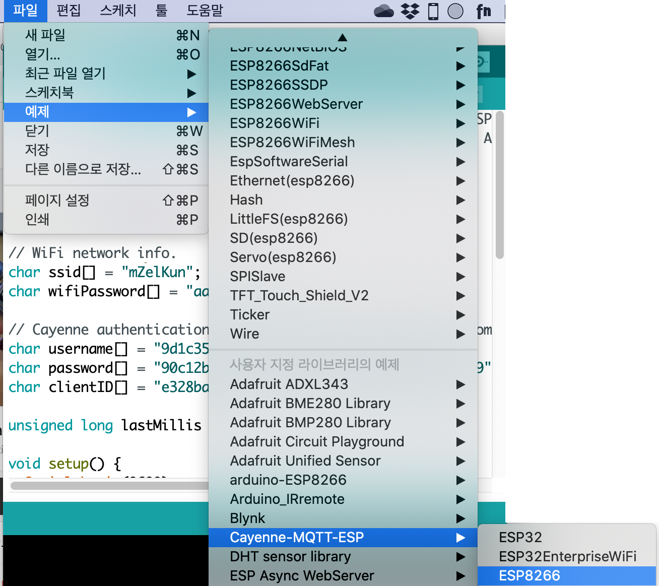 Cayenne-MQTT-ESP 라이브러리와 ESP8266 보드가 없다면 추가해줘야 합니다