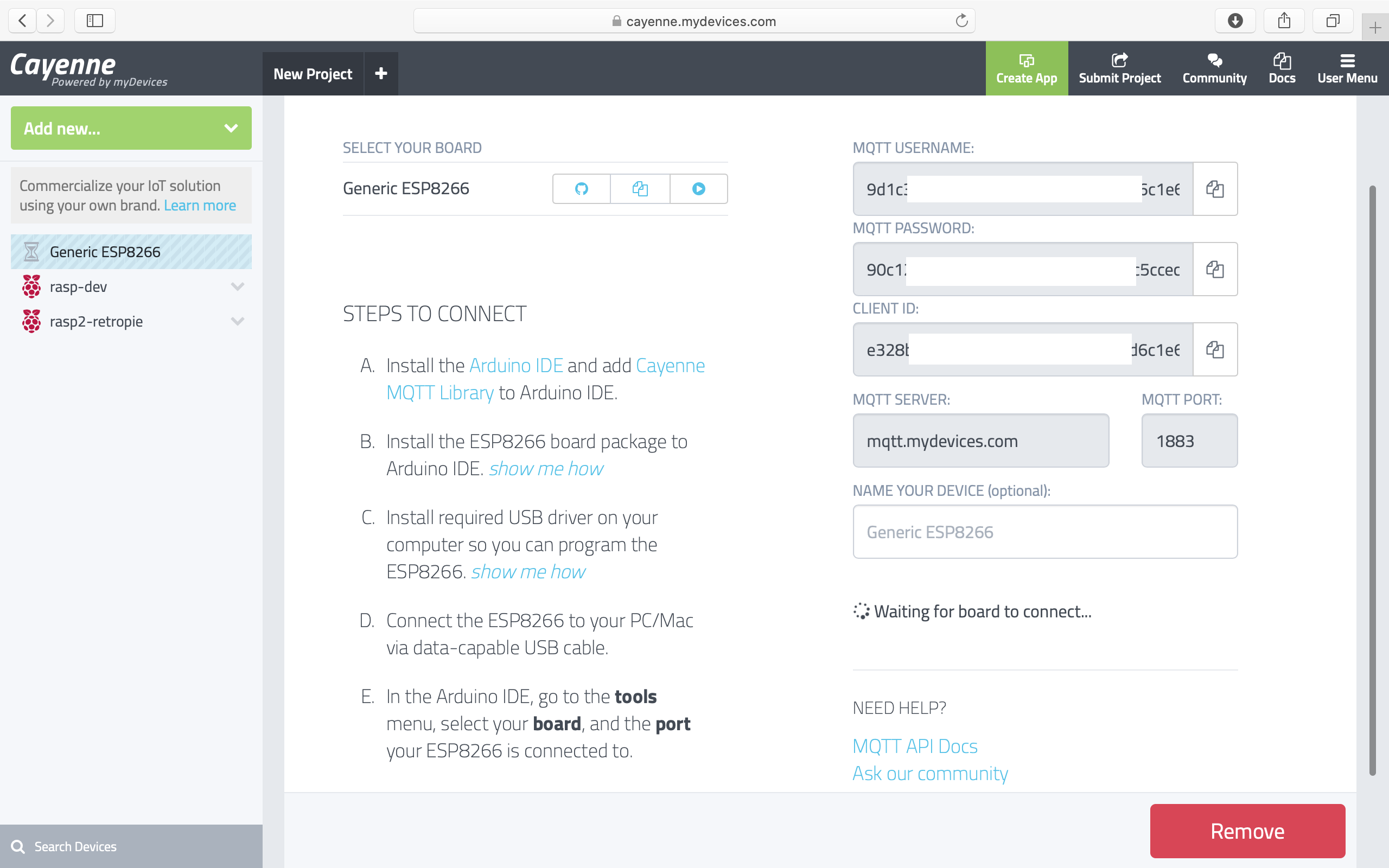 Cayenne-MQTT-ESP Lib: https://github.com/myDevicesIoT/Cayenne-MQTT-ESP