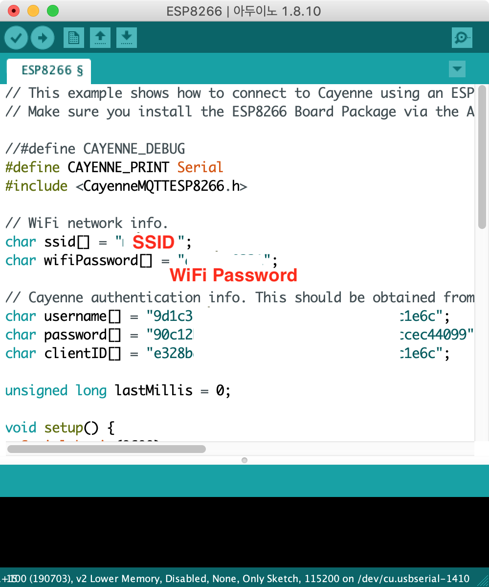 스케치를 열어 Cayenne-MQTT-ESP 예제를 실행해줍니다
