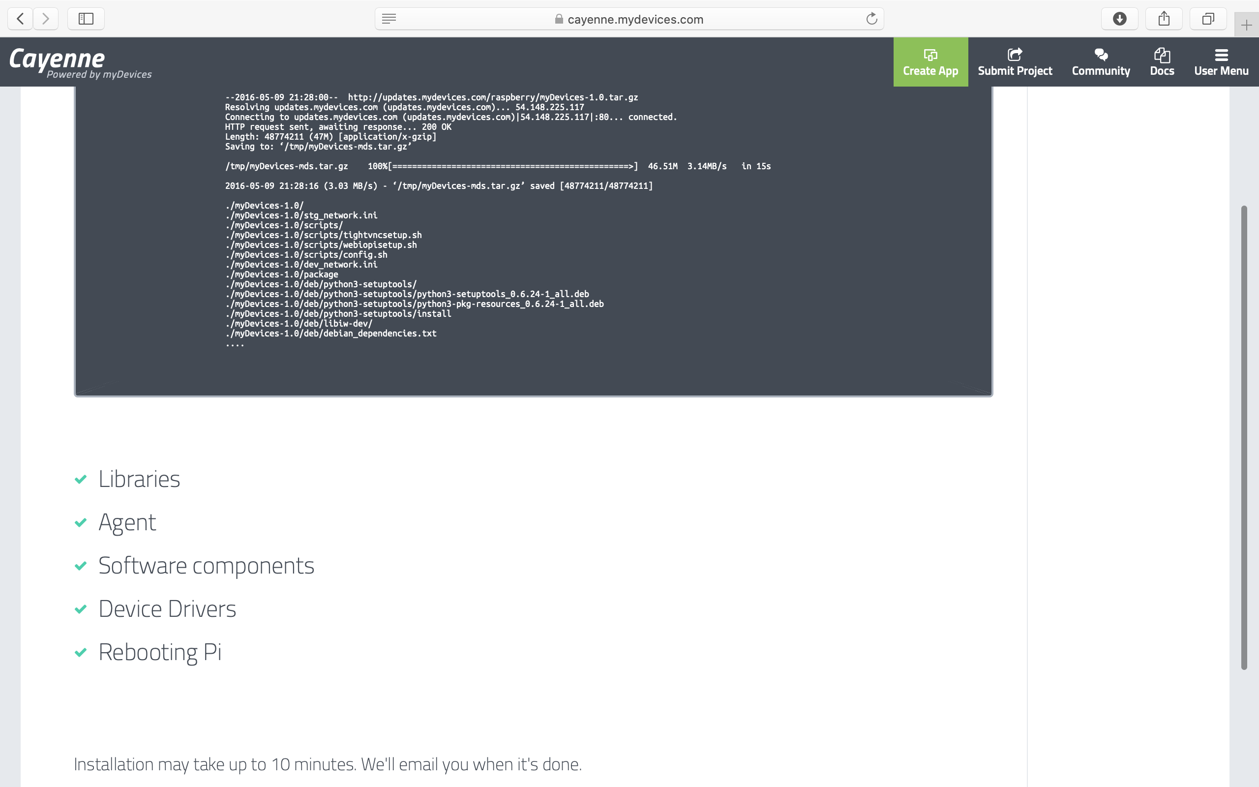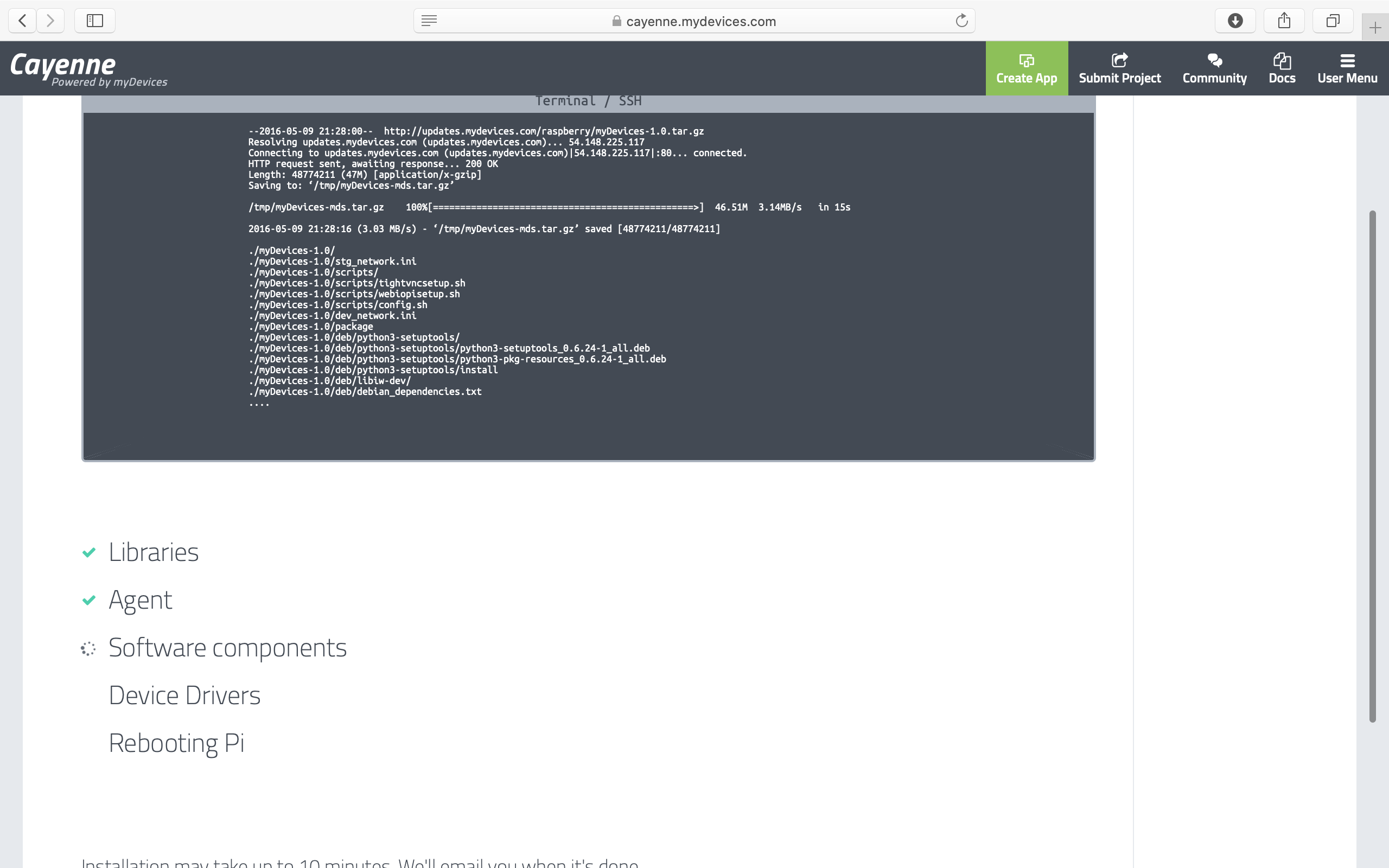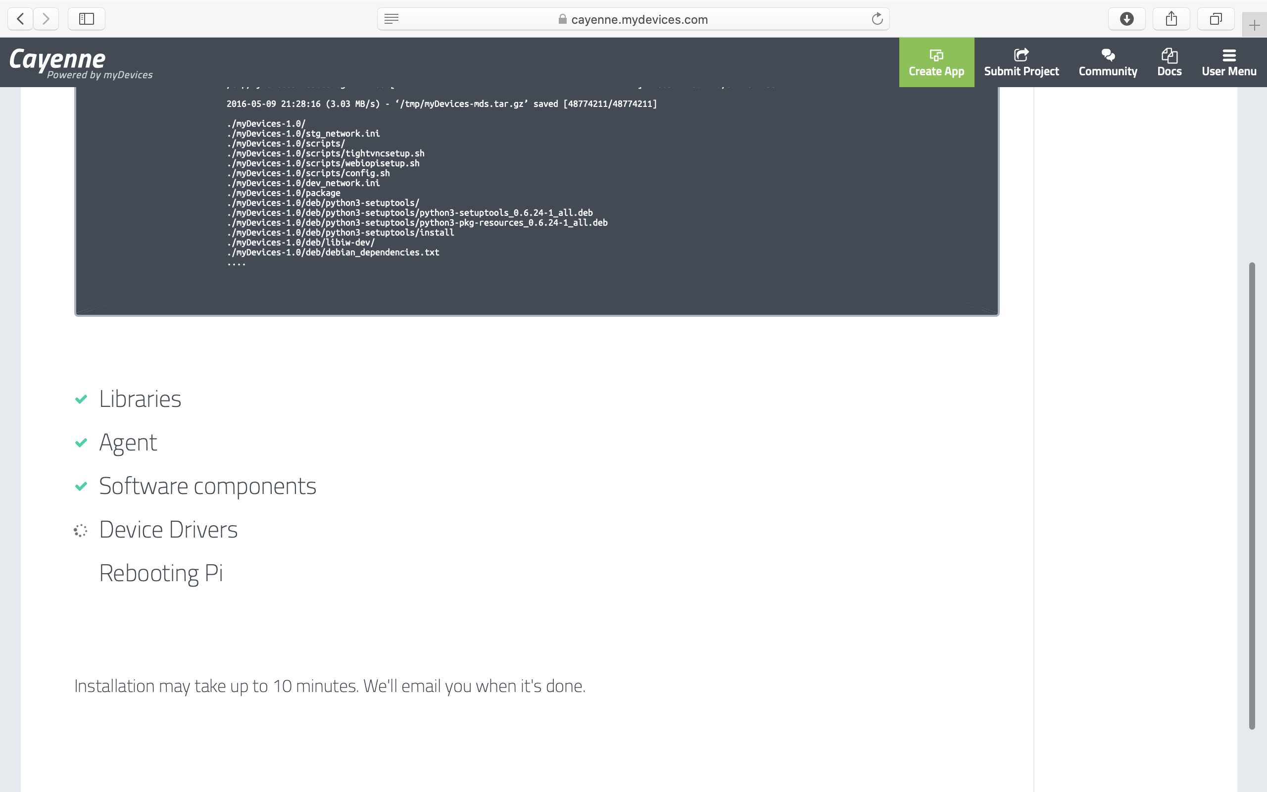 | pi@rasp-dev:~/utils $ sudo bash rpi_u6u1vp4tp6.sh -v rpi_arl8antmcc.sh continuing as new install... --2020-01-10 23:46:45-- https://updates.mydevices.com/raspberry/myDevices.tar.gz Resolving updates.mydevices.com (updates.mydevices.com)... 54.148.225.117 Connecting to updates.mydevices.com (updates.mydevices.com)|54.148.225.117|:443... connected. HTTP request sent, awaiting response... 200 OK Length: 103721 (101K) [application/x-gzip] Saving to: ‘/home/pi/utils/myDevices.tar.gz’ /home/pi/utils/myDe 100%[===================>] 101.29K 239KB/s in 0.4s 2020-01-10 23:46:46 (239 KB/s) - ‘/home/pi/utils/myDevices.tar.gz’ saved [103721/103721] ./myDevices/ ./myDevices/myDevices.service ./myDevices/live_network.ini ./myDevices/crontab.sh ./myDevices/tightvncsetup.sh ./myDevices/Cayenne-Agent/ ./myDevices/Cayenne-Agent/setup.py . . . Using /usr/lib/python3/dist-packages Finished processing dependencies for myDevices==2.0.3 writing list of installed files to '/etc/myDevices/uninstall/installed_agent' 2020. 01. 10. (금) 23:48:32 KST myDevices installed for Python 3.5.3 (98%) 2020. 01. 10. (금) 23:48:32 KST Configuring os and agent RealVNC detected (100%) 2020. 01. 10. (금) 23:48:37 KST Install finished (100%) 2020. 01. 10. (금) 23:48:42 KST Install cleanup finished Your system will reboot! |