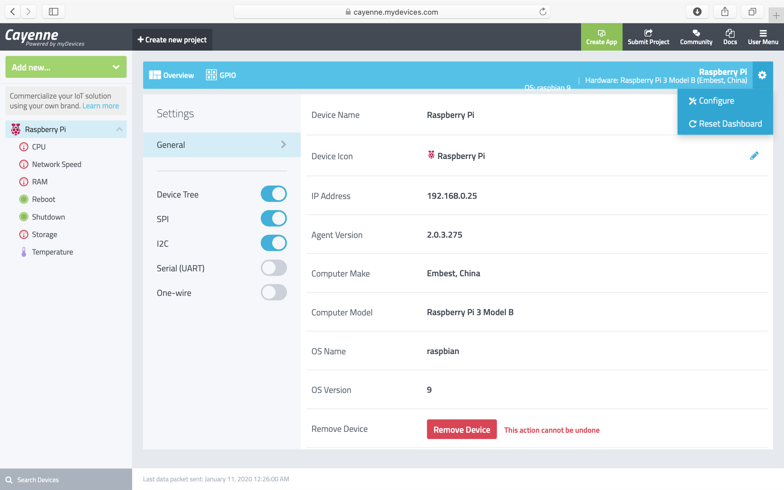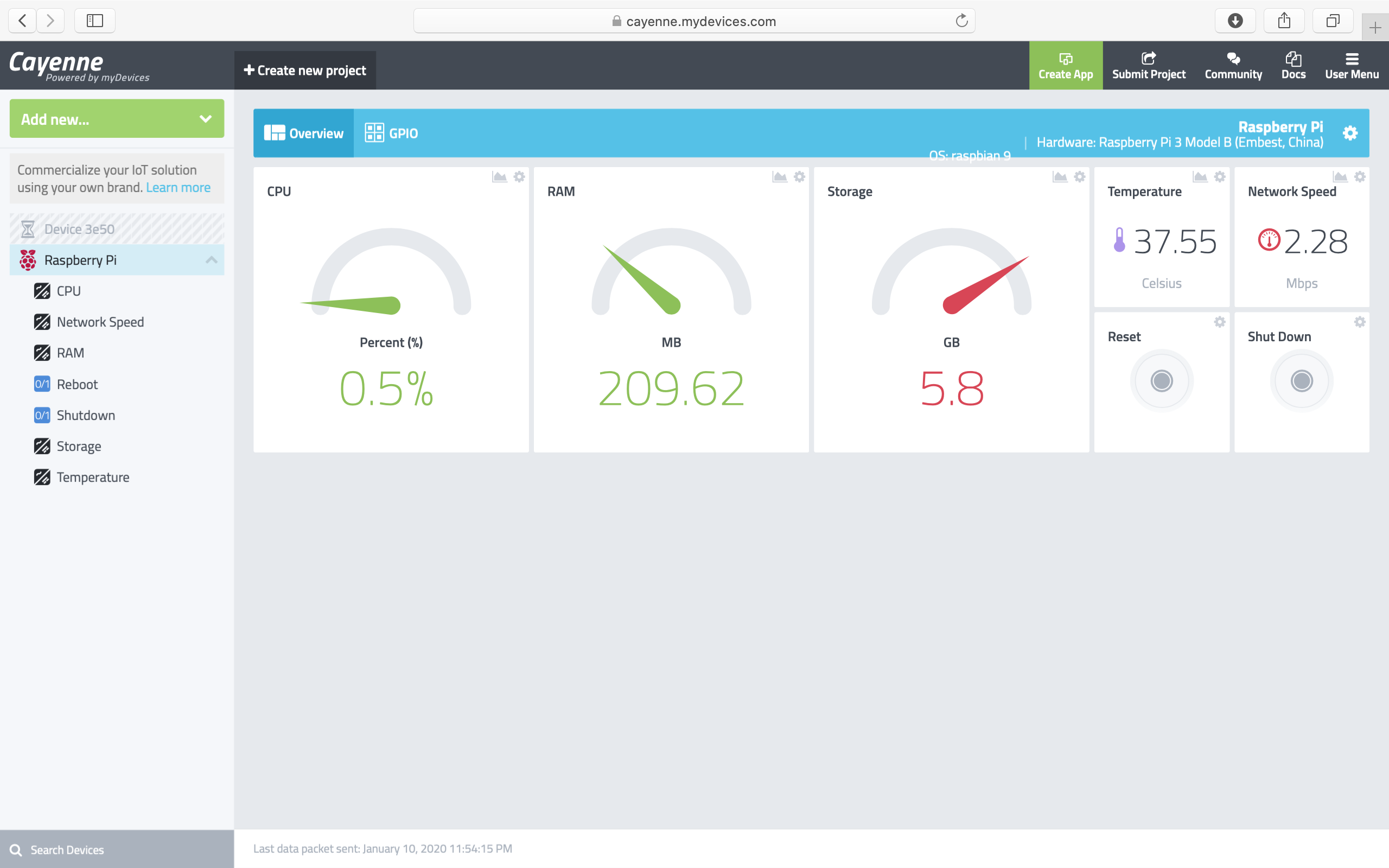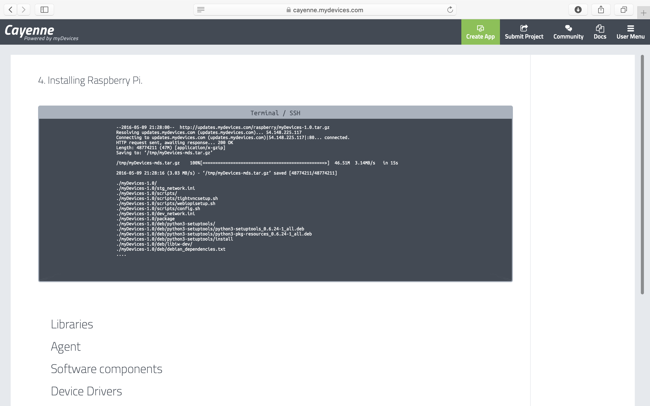 | pi@rasp-dev:~ $ cd utils/ pi@rasp-dev:~/utils $ ls apache-tomcat-9.0.12.tar.gz thingsboard-2.1.deb logmein-hamachi_2.1.0.198-1_armhf.deb thingsboard-windows-2.1.zip solr-8.2.0.tgz pi@rasp-dev:~/utils $ wget https://cayenne.mydevices.com/dl/rpi_u6u1vp4tp6.sh --2020-01-10 23:46:22-- https://cayenne.mydevices.com/dl/rpi_u6u1vp4tp6.sh Resolving cayenne.mydevices.com (cayenne.mydevices.com)... 54.156.191.83, 52.206.177.93 Connecting to cayenne.mydevices.com (cayenne.mydevices.com)|54.156.191.83|:443... connected. HTTP request sent, awaiting response... 200 OK Length: 1392 (1.4K) [text/x-sh] Saving to: ‘rpi_u6u1vp4tp6.sh’ rpi_arl8antmcc.sh 100%[===================>] 1.36K --.-KB/s in 0.003s 2020-01-10 23:46:25 (418 KB/s) - ‘rpi_u6u1vp4tp6.sh’ saved [1392/1392] |