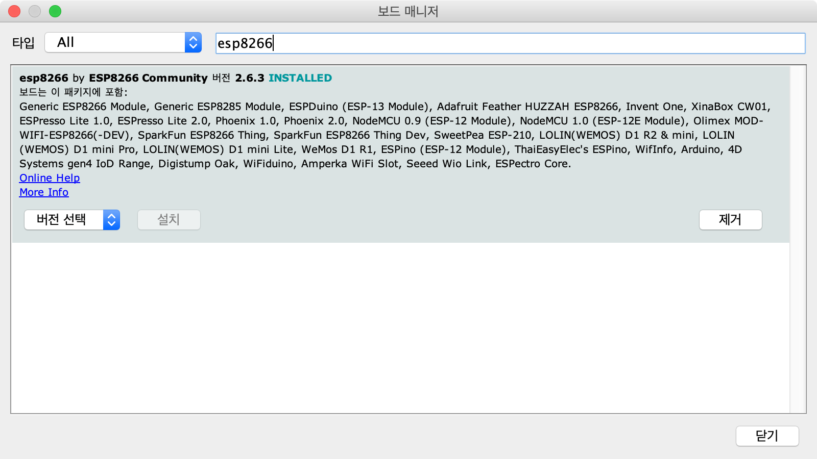 추가적인 보드매니져 URL 을 이용해서 esp8266 보드를 설치하면 됩니다