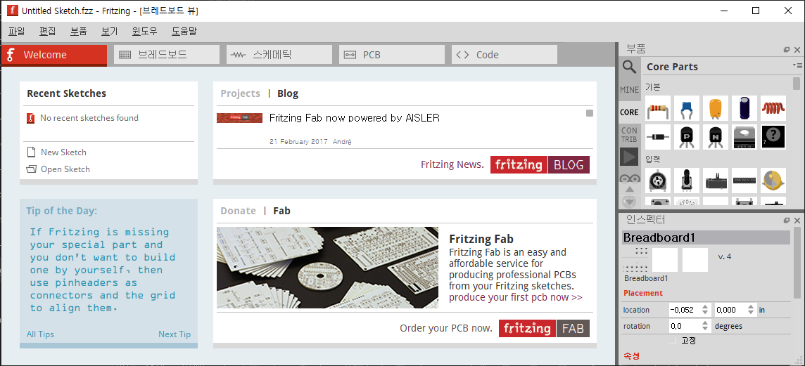 Fritzing.exe를 실행하면 화면이 잘나온다