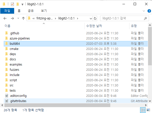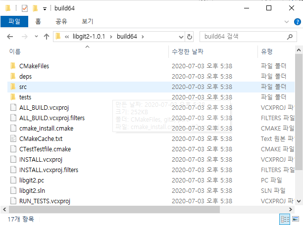 디렉토리를 libgit2-1.0.1 -> libgit2 로 변경을 해줘야 한다..