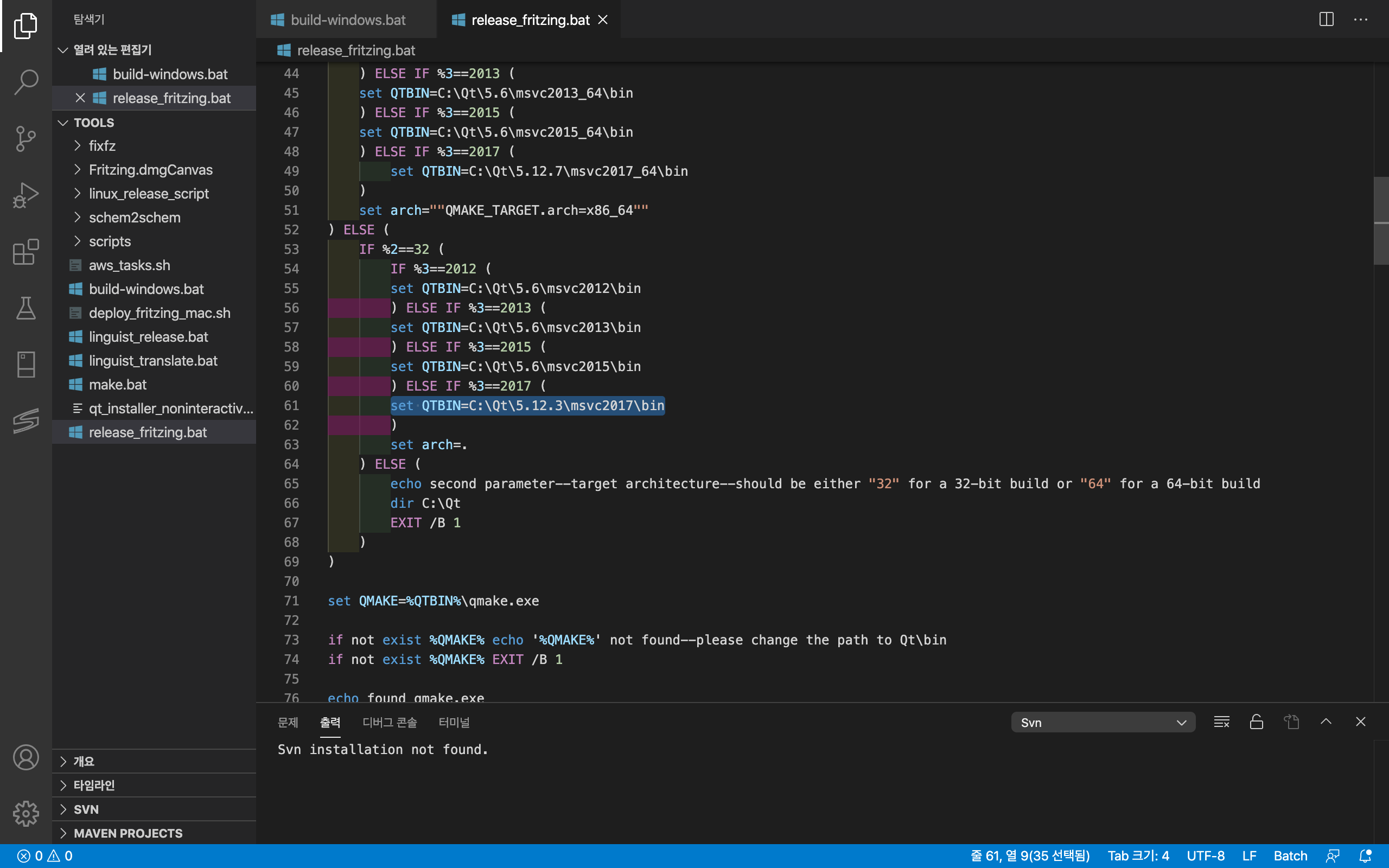 tools/release_fritzing.bat 파일을 열어 환경에 맞춰서 수정을 해줘야 한다