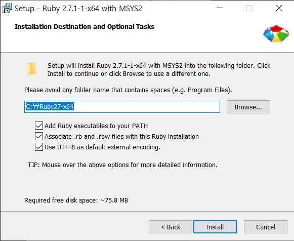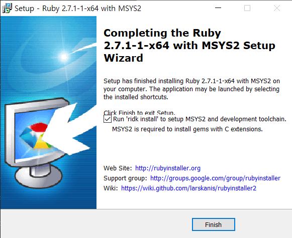 rubyinstaller-devkit-2.7.1-1-x64.exe 버전을 다운받아서 PC 설치했다