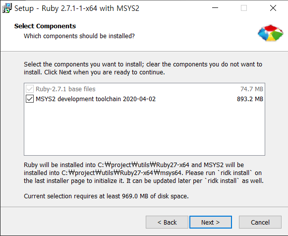 취소했다면 ridk install 명령으로 다시 실행 시킬수 있다