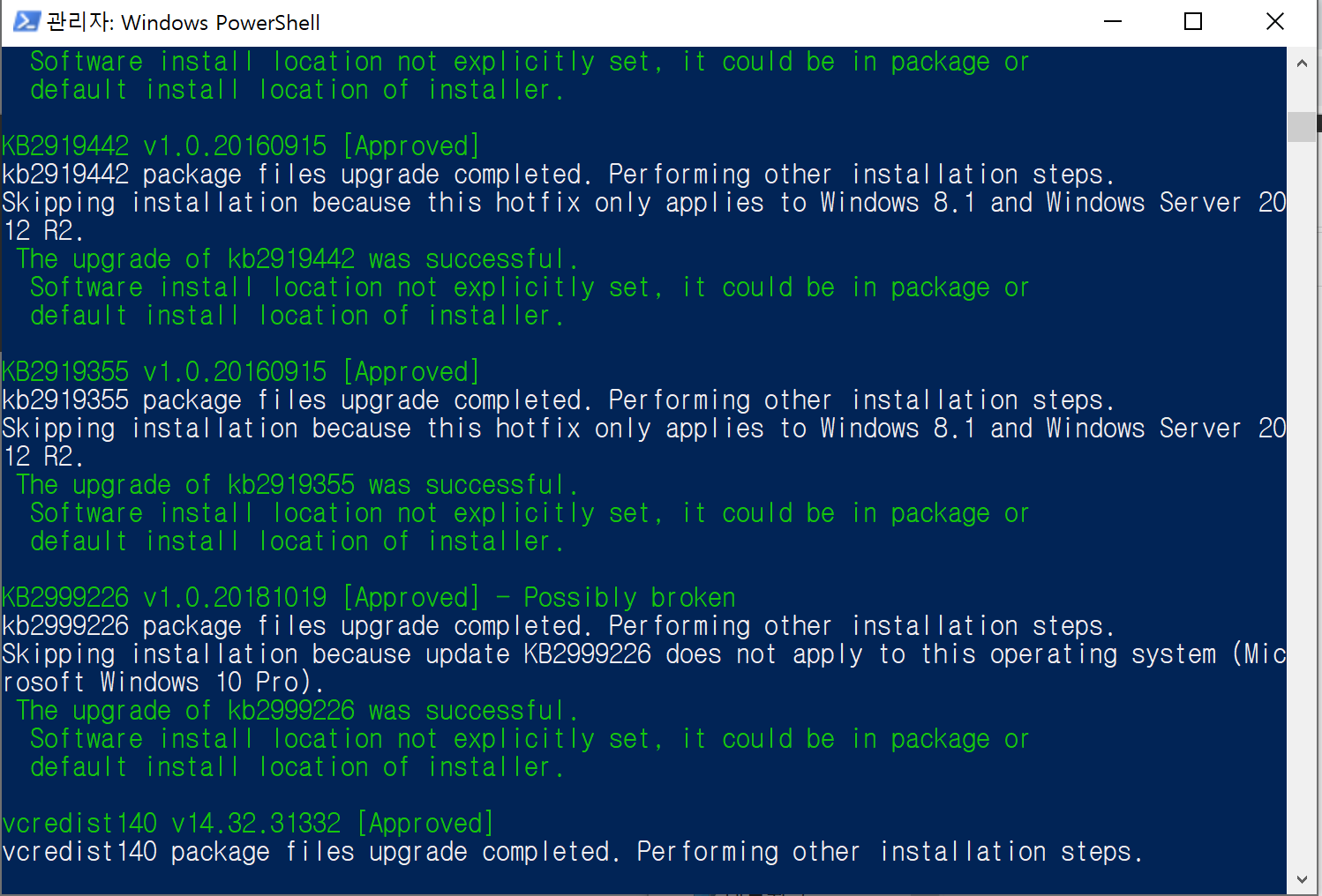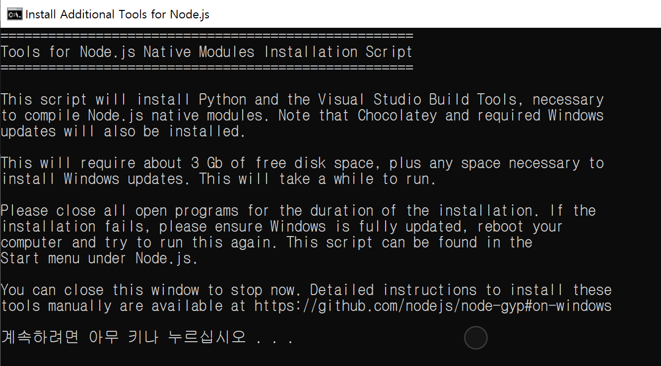 하지만 위쫏에 필수툴 설치 체크해줘서 파워쉘이 뜨며 추가적으로 설치가 진행됩니다
